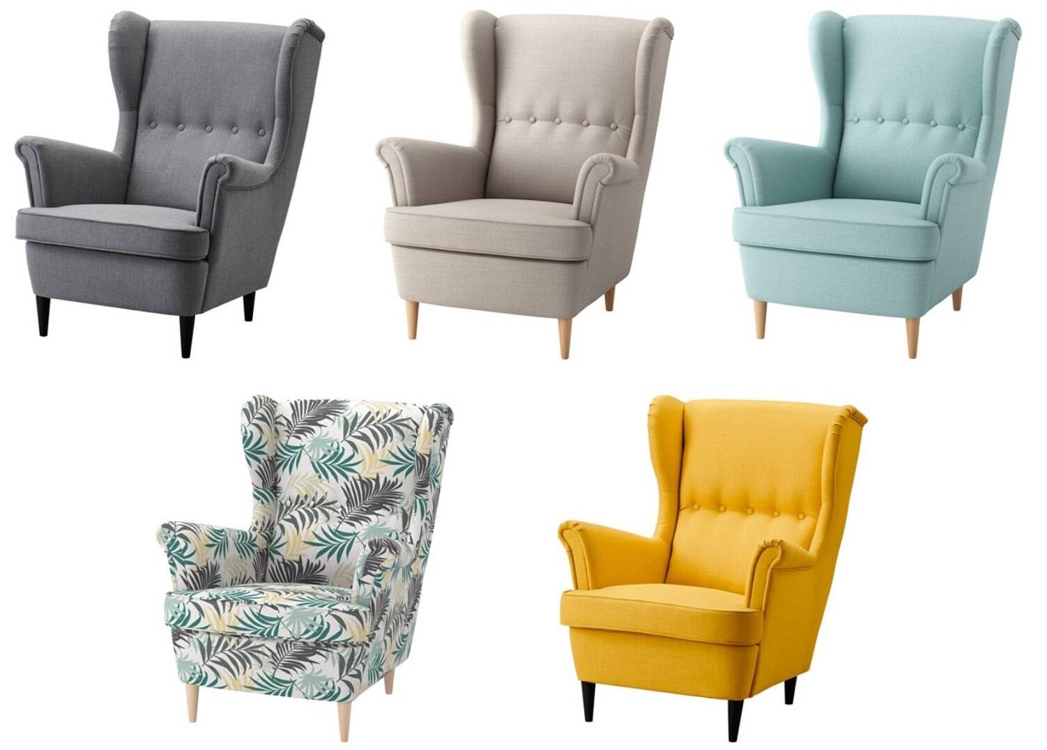 В некоторых линейках присутствует белый цвет. Такие обивки бывают у раскладных кресел-кроватей или подвесных моделей из ротанга. Белая мебель подходит для спальни, загородного дома. Красиво смотрится меховой белоснежный чехол у кресла-яйца или кресла-мешка. Черный цвет чаще используется для офисных моделей, подходит для кабинета или строгой гостиной в аристократическом стиле. Яркие расцветки выбираются для комнат, оформленных в современном стиле, ретро или кантри. Чаще всего используются желтые оттенки, красный, зеленый, синий, оранжевый цвета. Кроме однотонного оформления, мебель ИКЕА часто имеет разноцветную обивку. Особенно хорошо такие кресла вписываются в детскую комнату. Они могут быть оформлены рисунками, цветочными принтами, геометрическими узорами.