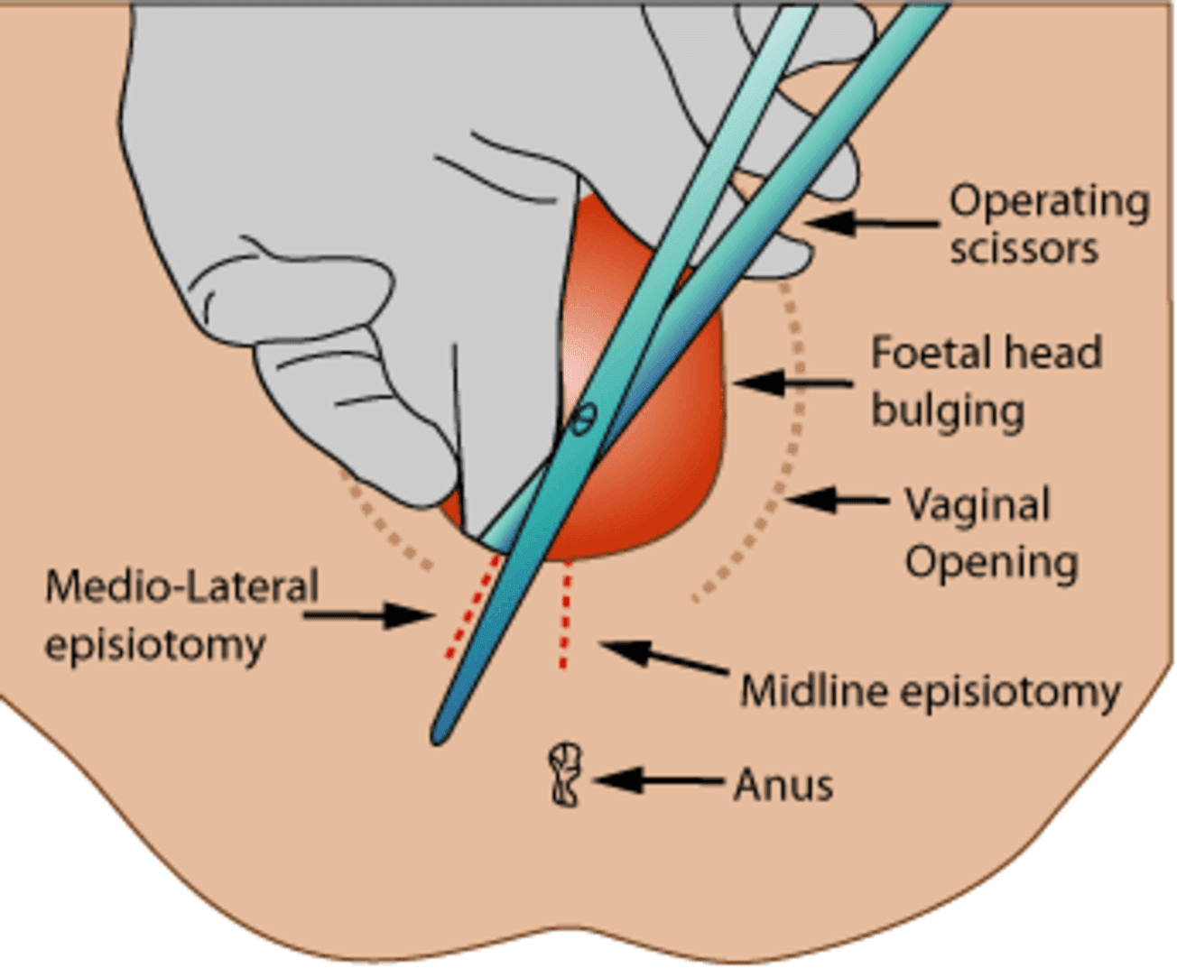 Разрез тканей промежности выполняют на высоте потуги, в момент, когда головка ребенка максимально растягивает ткани кольца вульвы. Предварительно обработав кожу промежности и наружных половых органов 1 % йодонатом, приступают к операции. Эпизиотомию, как правило, выполняет врач-акушер, крайне редко акушерка (в экстримальных условиях, если врача нет). Вне потуги между стенкой влагалища и головой ребенка врач вводит один-два пальца, после чего, под контролем введенных ранее пальцев он вводит браншу стерильных ножниц или скальпель на расстояние, которое соответствует длине предполагаемого разреза. Дождавшись потуги, на ее высоте врач делает латеральный разрез. Придерживая головку ребенка, акушерка предотвращает быстрое изгнание плода и, тем самым, предупреждает развитие дополнительных разрывов промежности.