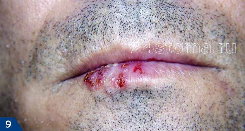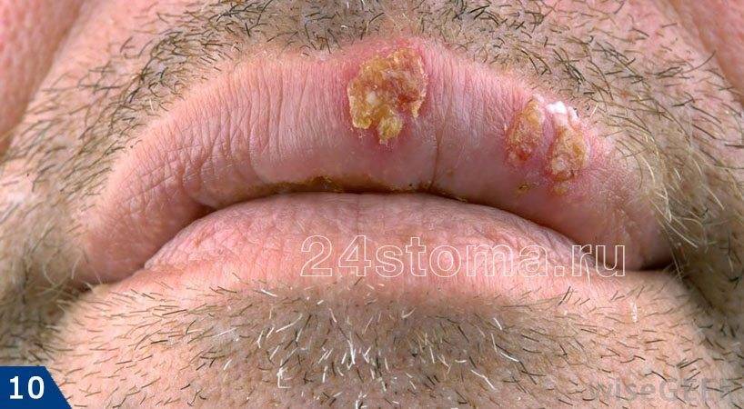 Обычно на 3 день все крошечные пузырьки лопаются и, объединяясь, создают одну большую «мокрую язву» (рис.7). Кстати, в этот период вскрытия пузырьков иногда может возникать небольшое увеличение температуры тела + увеличение поднижечелюстных лимфатических узлов. Примерно на 4-6 день поверхность изъязвления покрывается корочками (рис.8-10). Эта стадия по прежнему заразна, т.к. из трещин в корочках по-прежнему выделяется жидкость, богатая вирусом.