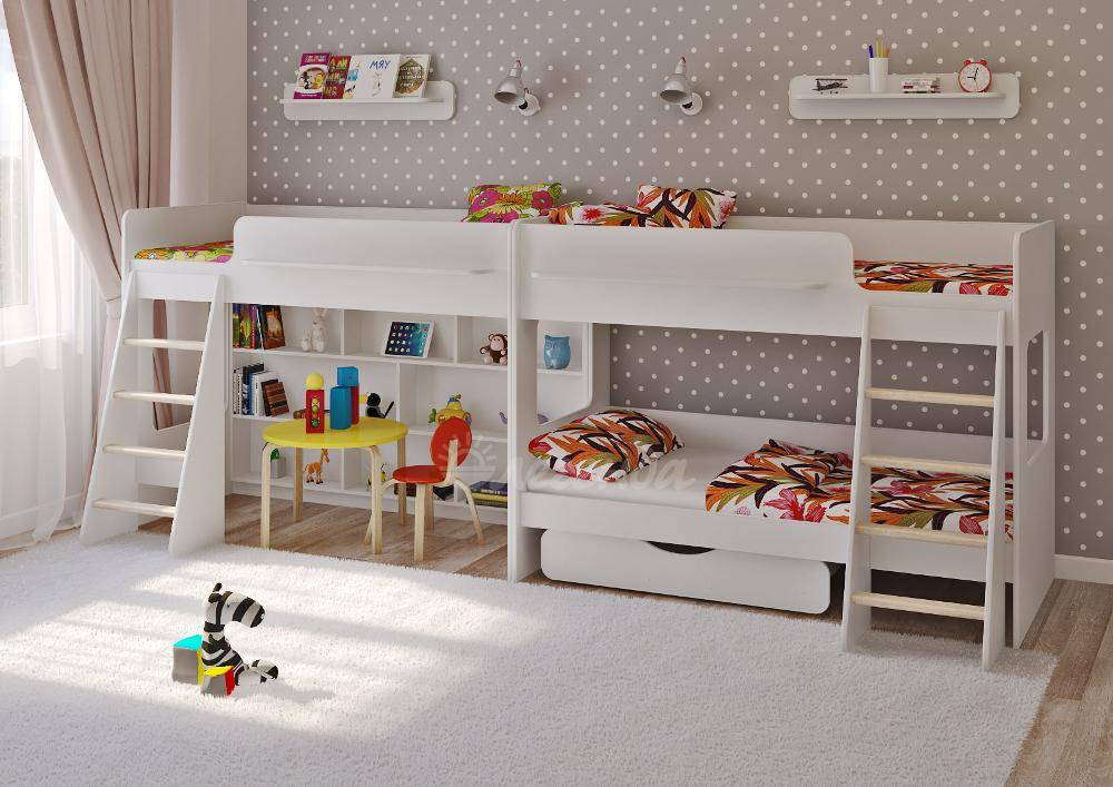 Выбор кровати для ребёнка всегда сопряжён с многочисленными нюансами. Перед родителями стоит непростая задача приобрести максимально качественную, компактную и в то же время красивую модель. Когда дело касается обустройства детской для троих детей, проблема возрастает в разы, к тому же здесь появляется ещё и финансовый вопрос. Три кровати стоят гораздо дороже одной. Для решения всех этих вопросов дизайнеры разработали самые разнообразные совмещённые модели для трёх и более детей. Родителям осталось только прийти в магазин и оформить покупку.