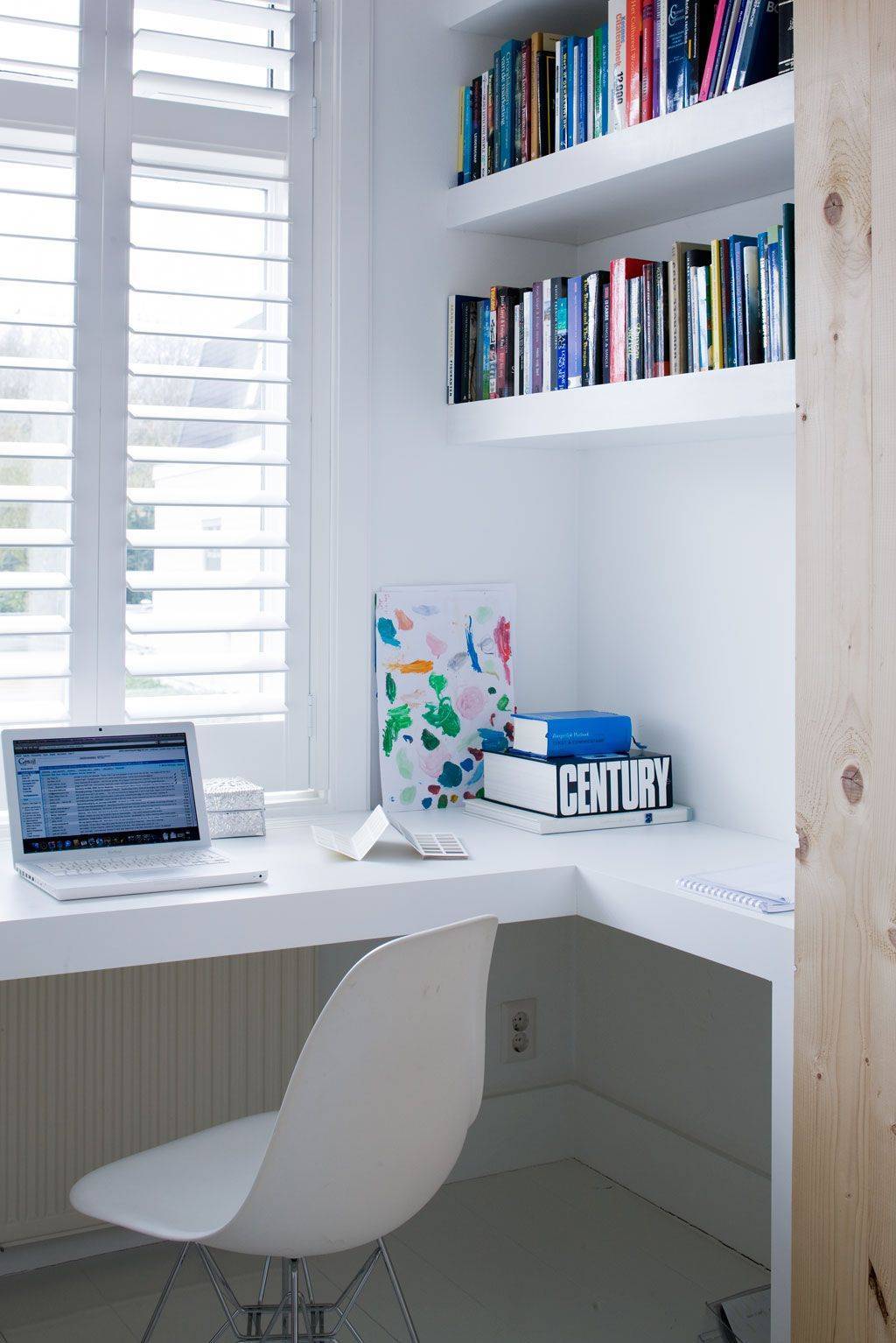2) Даже в малогабаритной комнате найдется место для небольшого, но полноценного школьного стола, если сделать его угловым. Из-за небольшой рабочей плоскости приходится очень тщательно продумывать наличие полок, ниш, мобильных тумб (на колесиках): чем больше подобных элементов, тем удобней ребенку заниматься.