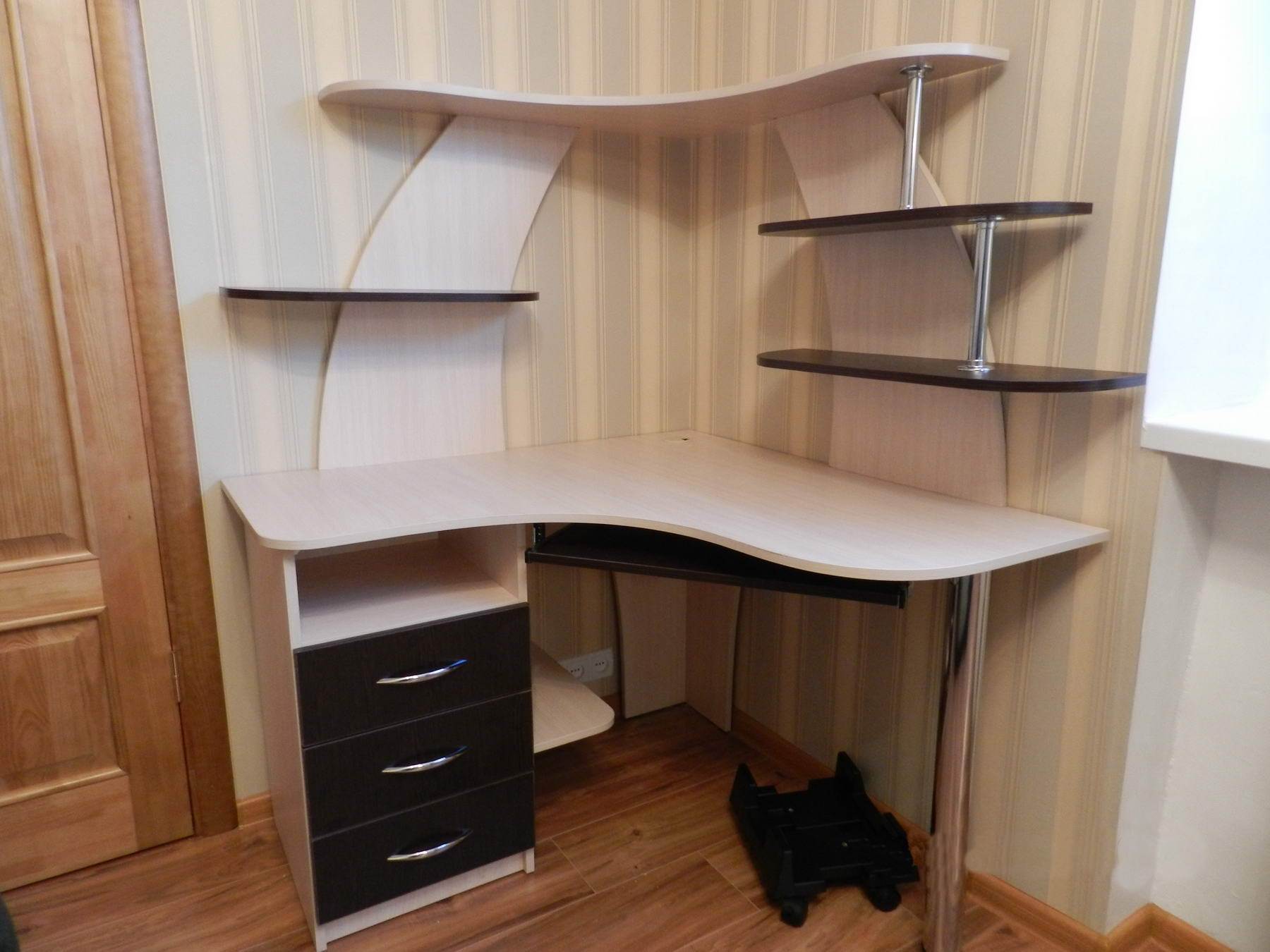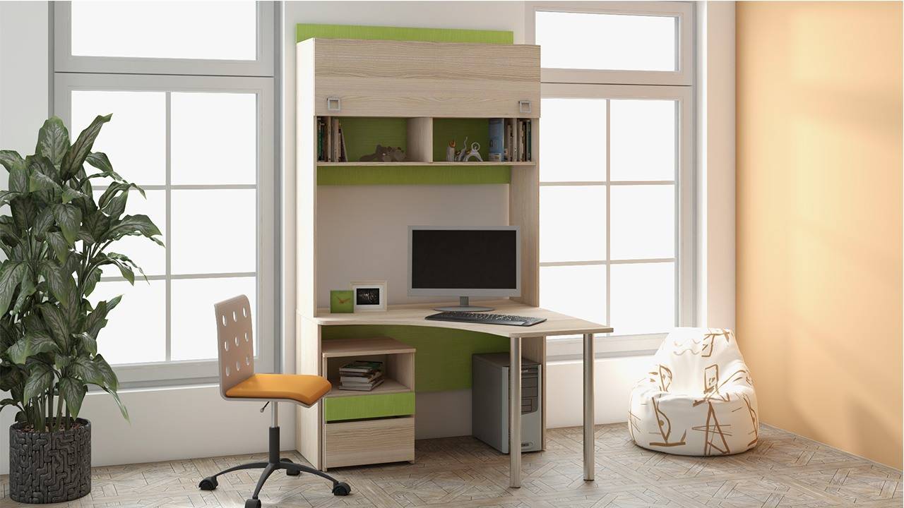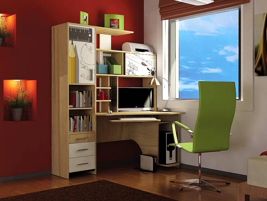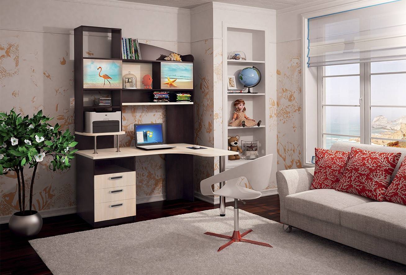 - Вариативность форм и размеров – всегда можно изготовить под заказ или купить угловой стол школьника, в котором столешница будет оснащена закруглениями, надстройкой, дополнительными полками для печатной техники, выдвижной полкой для клавиатуры, различными нишами и т. п. Кроме того, в угловых конструкциях столешница может быть гораздо уже принятых стандартов.