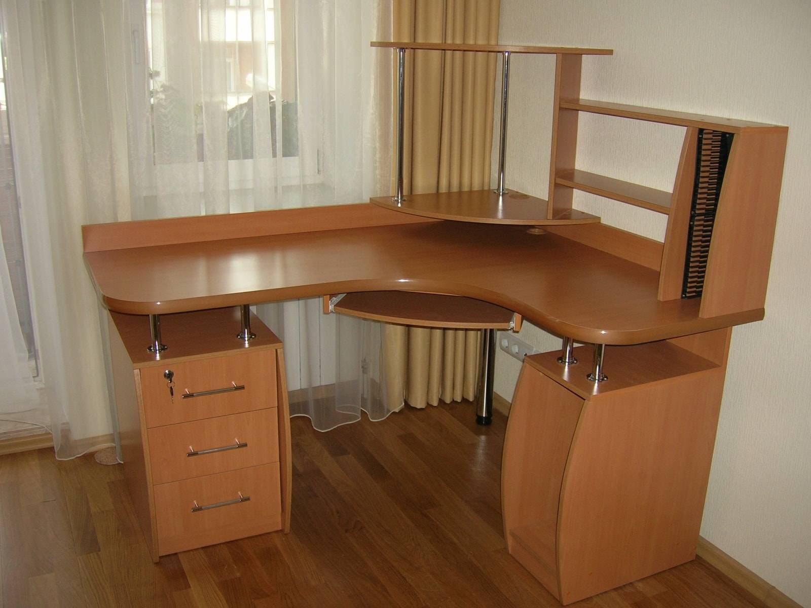 Функциональным и практичным является г-образный письменный стол с ящиками и полками. Он пользуется большой популярностью в малогабаритных помещениях. Занимая неиспользуемый угол, он практически не уменьшает полезную площадь, прекрасно совмещая компьютерный и письменный стол.