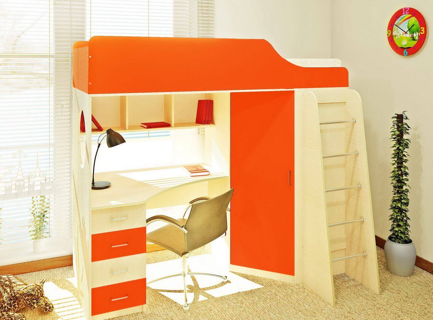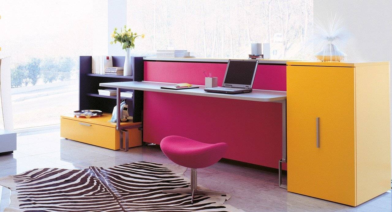 Письменный стол для дома, совмещенный с кроватью, считается лучшим выбором мебели для комнаты с небольшими габаритами. Он представляет собой сложную двухэтажную конструкцию. На первом этаже находится сам стол с ящиками и полками, а кровать – на втором. Такая модель может расширить игровую зону детской комнаты.