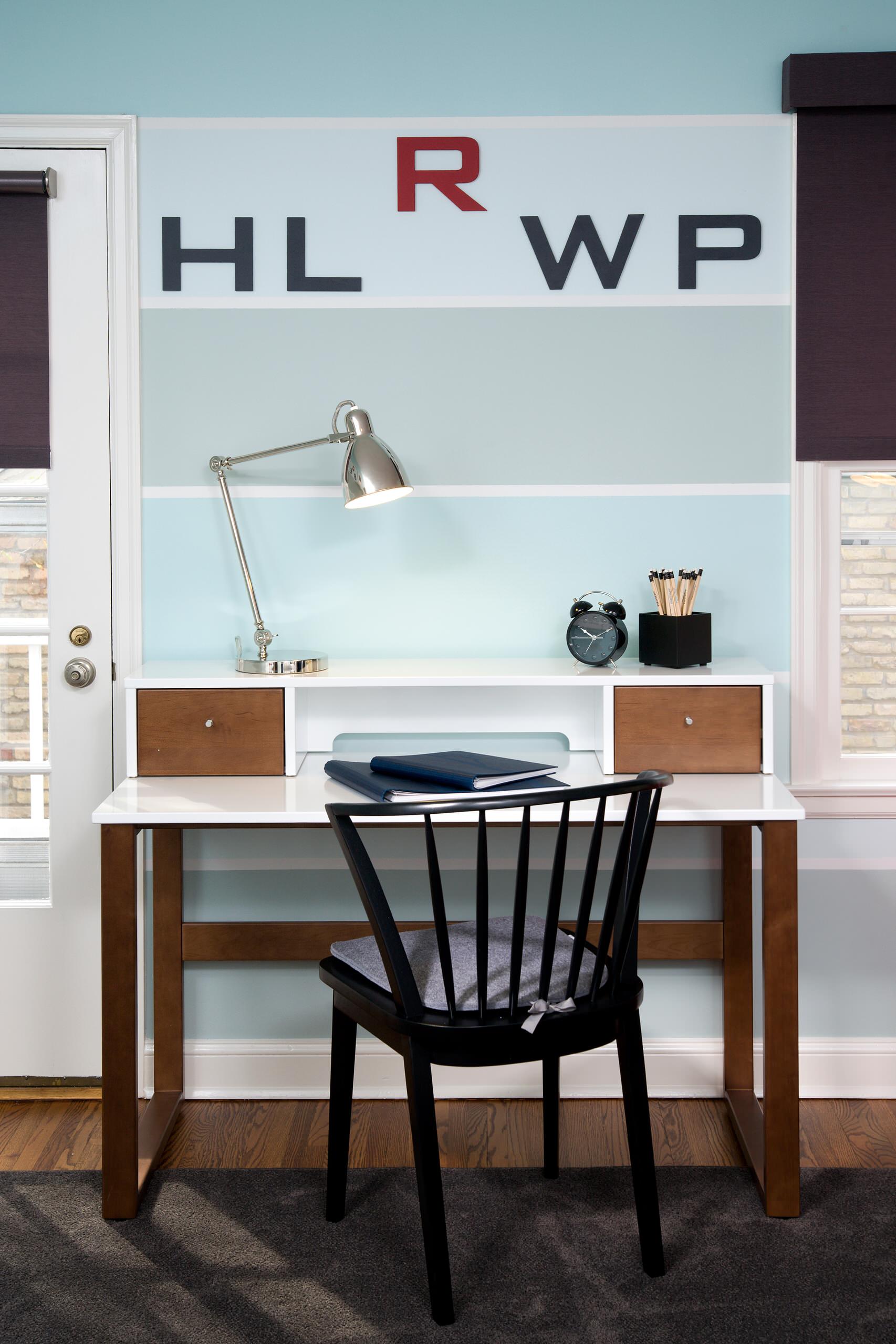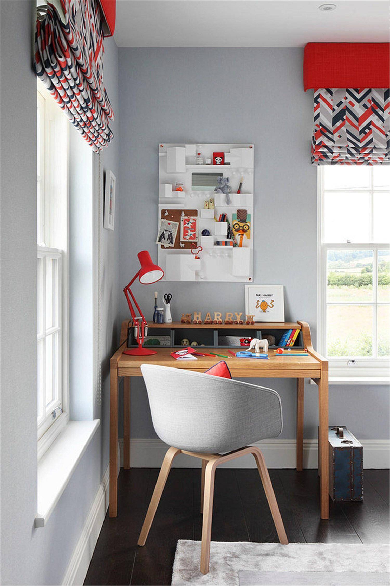 В детской с рабочей зоной у окна лучше использовать короткие шторы. На фото выше — рулонные шторы «день-ночь». Их можно регулировать по высоте и степени освещенности комнаты.