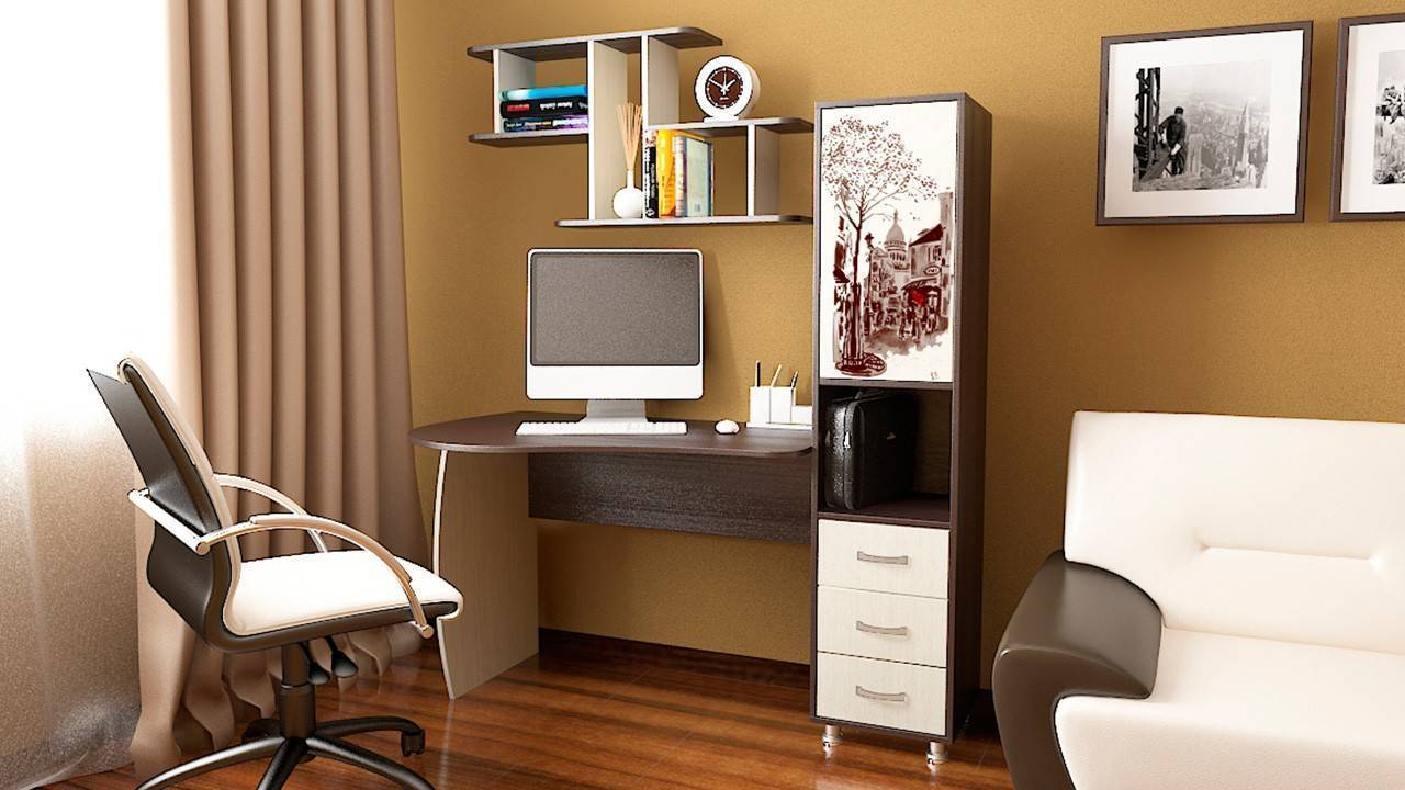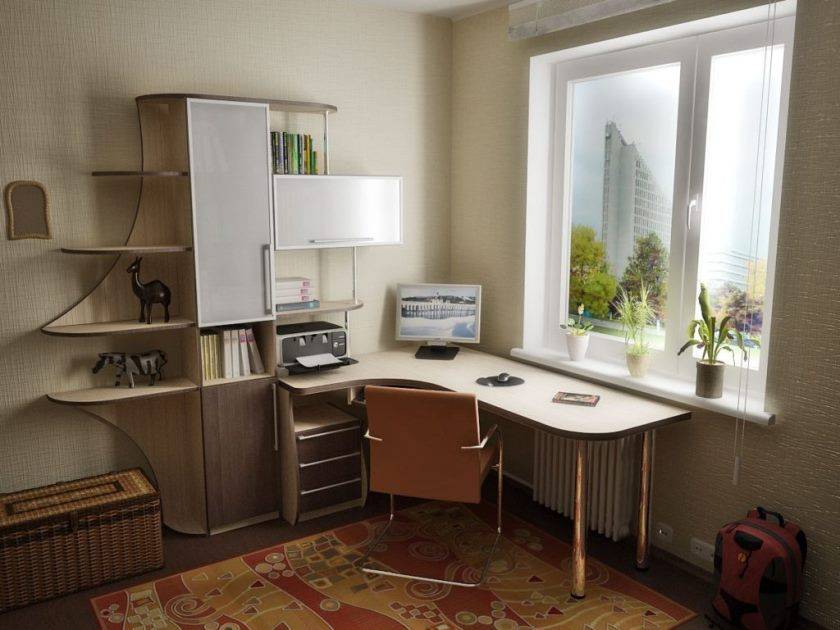Угловые столы помогают освободить место в комнате для шкафа, кровати или техники. Но если места совсем мало, то рекомендуется разместить в комнате кровать-чердак, а рабочую зону — под ней.