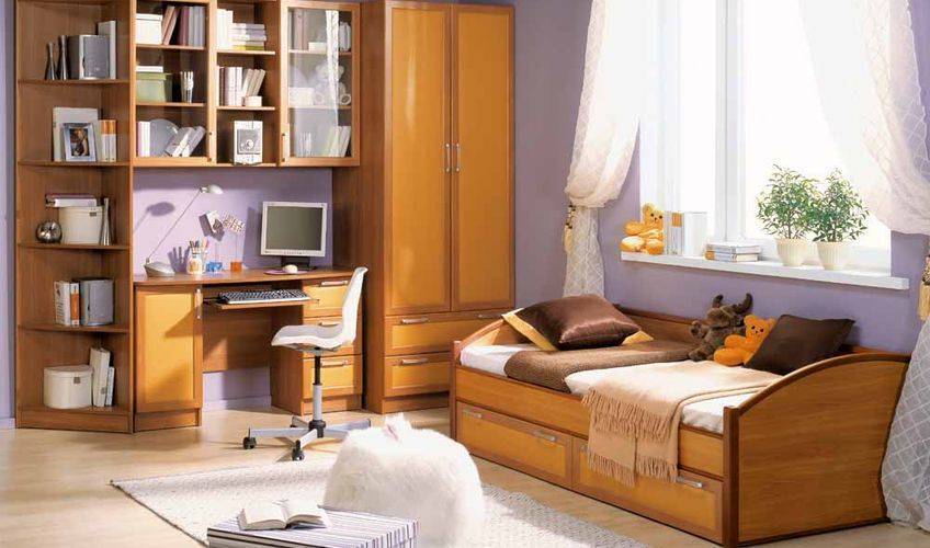 Ассортимент мебельной продукции условно подразделяется по внешним различиям (форма, стиль, цвет), размерам, оснащению (полки, ящики, ниши, надстройки) и применяемым материалам. Второй угол можно занять шкафом — примеры комнат можно посмотреть в нашей фотоподборке.