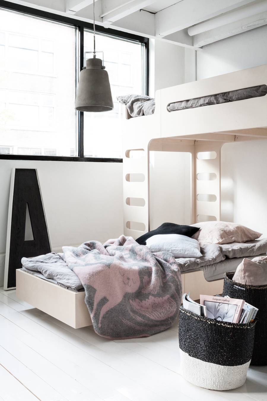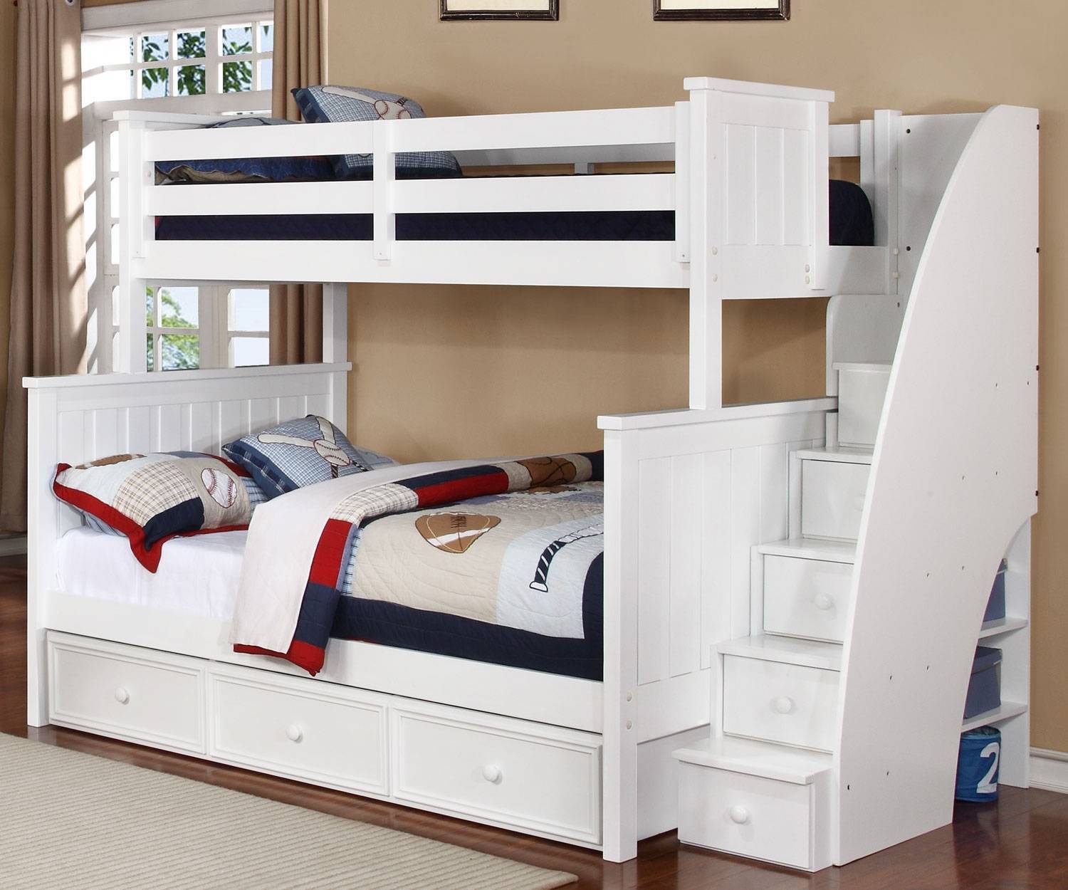 - классический вариант. Стационарно спальные места расположены на разных ярусах. От нижнего этажа к верхнему ведет удобная лестница, которая может быть выполнена как из ступеней с перилами, так и, к примеру, из ящиков для белья, собранных в пенал, ступенями которого будут служить ручки. Для такой кровати изначально нужно придумать удобное место в комнате, в случае возможности и желания — соединить со стеной для максимальной безопасности. Возраст детей — от 4-х лет;
