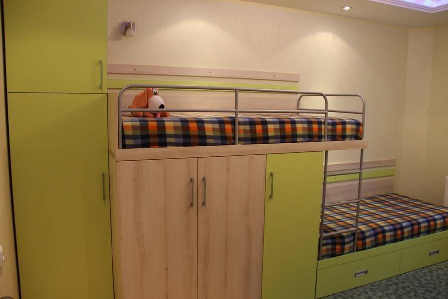 Самое простое решение – это обыкновенная двухъярусная кровать плюс отдельный шкаф или любая другая мебель, расположенная рядом, вдоль соседней стены. Такая мебель удобна для перепланировки, за счет чего можно рассчитывать на ее длительное использование. В виде альтернативы возможно частичное нависание верхнего яруса над таким боковым шкафом.