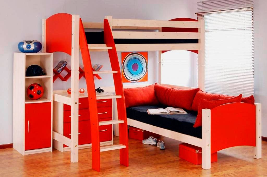 Если же комната маленькая и у кровати должны быть разные функции, то стоит обратить внимание на трансформеры и чердаки. Хорошо зарекомендовали себя детские модели, предлагающие дополнительные места хранения — встроенные шкафы, письменные столы, тумбочки