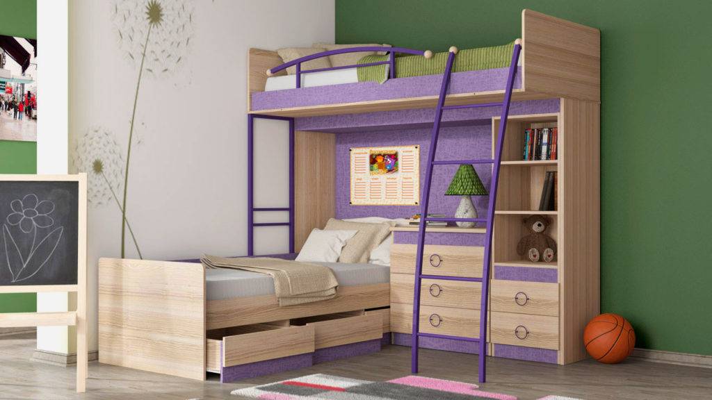 Позволяет разместить и спальные места, и рабочее место, и даже шкафы и ящики. Это самый настоящий детский комплекс, компактный и комфортный.