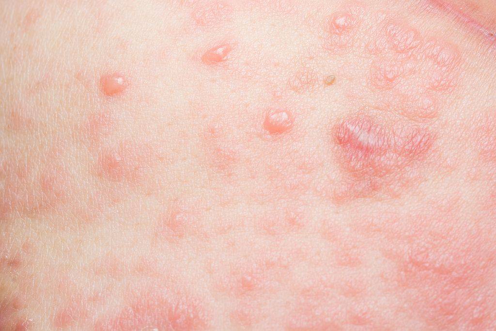 Элементы сыпи поначалу выглядят небольшими красными пятнышками, которые преобразуются в папулы и везикулы с прозрачной жидкостью внутри. Они распространяются по всему телу, за исключением ладоней и подошв, а после вскрытия на их месте образуются корочки.